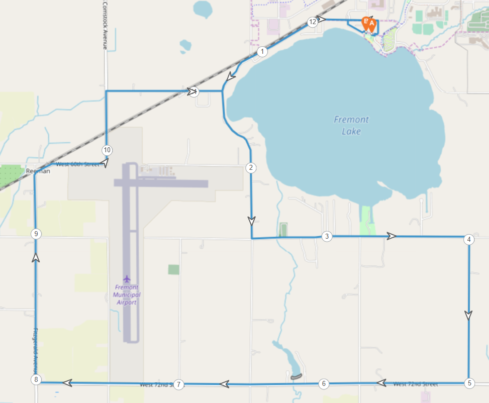 The bike route will go out of the transition area to Second Street. Left on Lake Drive for about 2.5 miles. Left on 64th Street for about 1.5 miles. Right on Osborn Avenue for 1 mile. Right on 72nd Street for about 3 miles. Right on Fitzgerald Avenue about 1.5 miles, keep right after the church on 60th Street to Comstock Avenue for about 0.5 mile. Right on 56th Street for about 1 mile. Left on Lake Drive about 1.5 miles. Right on Glen Avenue to transition area.
